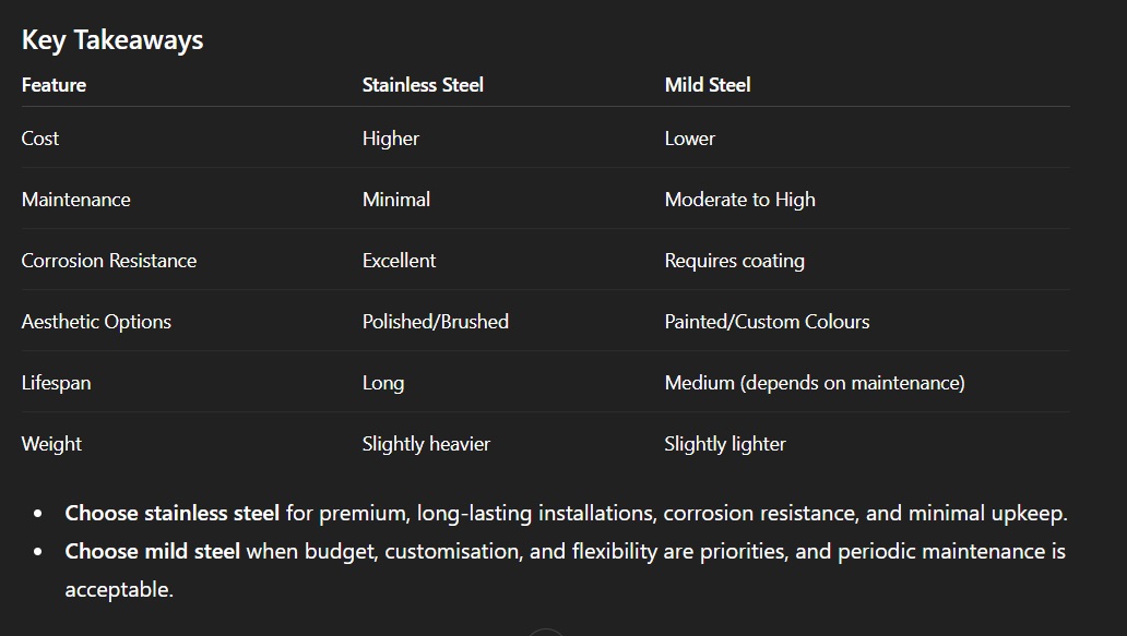 - Shorter lifespan outdoors: Even with protective coatings, mild steel may need replacing sooner than stainless steel in harsh environments.